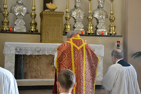 Outro detalhe: as orações ao pé do altar são muito breves. Tem o comecinho do salmo 42, mas não se reza ele todo, como nós. O "Introibo ad altarde Dei, ad Deum qui laetificat juventutem meam" está lá, mas dali o sacerdote chama os fiéis a confessarem seus pecados e ele começa o confiteor, seguido pelos fiéis, tal como nós no Rito Romano. Confiteor, que claro, tem Sto. Ambrósio entre os santos a quem invocamos. Claro, né? :P